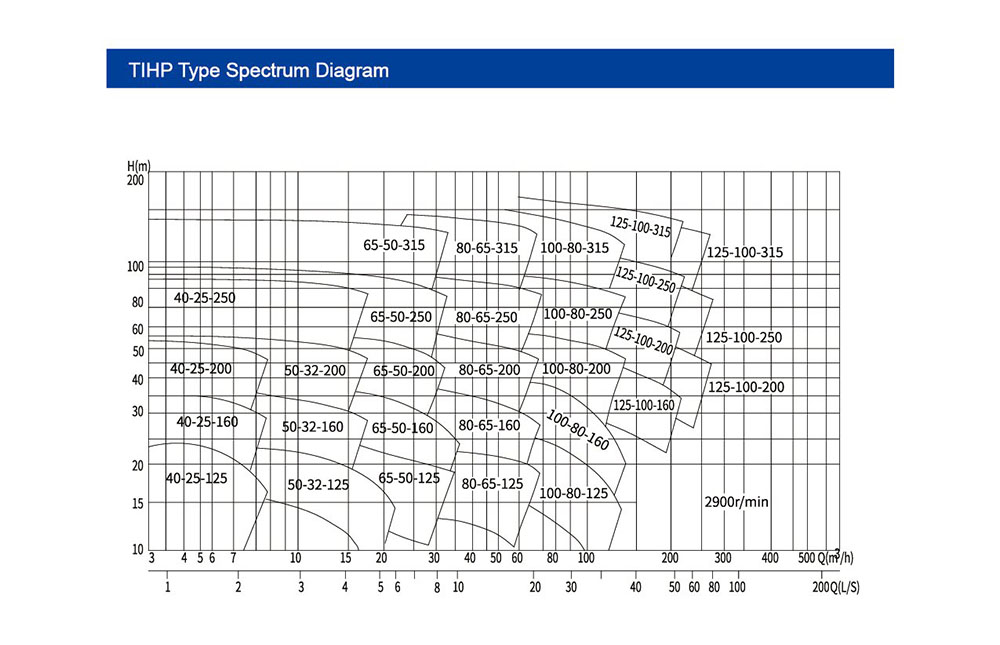 ပုံတွင်ခါးဆစ်နှင့်ဇုန်များပါ 0 င်သည်။ တစ်ခုချင်းစီသည် Pump Model ကိုကိုယ်စားပြုသည်။ ဥပမာအားဖြင့် "40-25-125" နှင့် "50-32-160" ကွဲပြားခြားနားသောစုပ်စက်မော်ဒယ်များကိုဆိုလိုသည်။